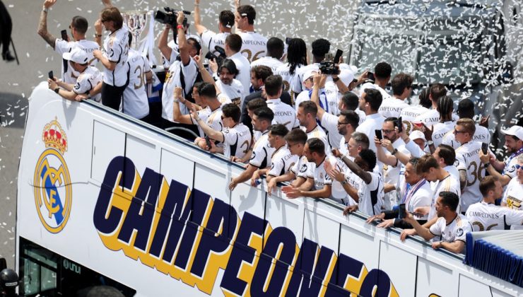 Bu sezon İspanya Süper Kupası’ndan sonra lig şampiyonluğunu da kazanan Real Madrid’in kent merkezindeki kutlamalarını binlerce taraftarı izledi.