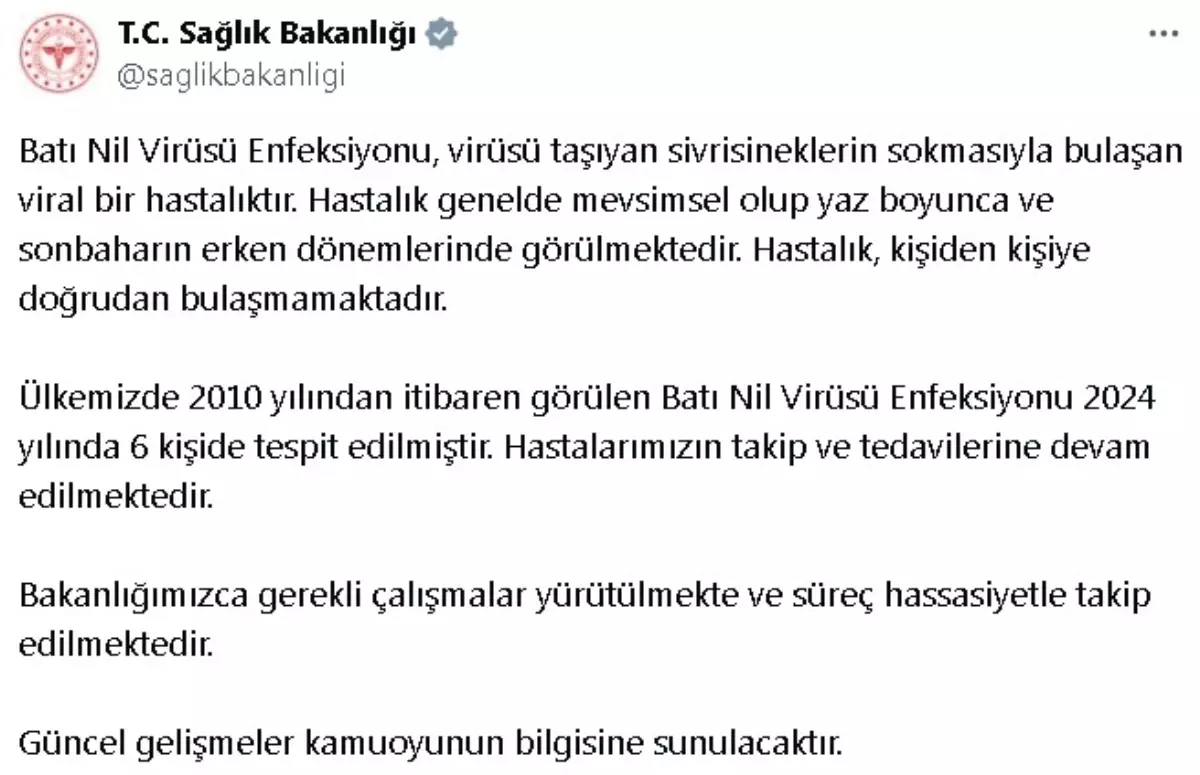 Sağlık Bakanlığı sosyal medya hesabından yapılan açıklamada, “Batı Nil Virüsü Enfeksiyonu, virüsü taşıyan sivrisineklerin sokmasıyla bulaşan viral bir hastalıktır. Hastalık genelde mevsimsel olup yaz boyunca ve sonbaharın erken dönemlerinde görülmektedir. Hastalık, kişiden kişiye doğrudan bulaşmamaktadır. Ülkemizde 2010 yılından itibaren görülen Batı Nil Virüsü Enfeksiyonu 2024 yılında 6 kişide tespit edilmiştir. Hastalarımızın takip ve tedavilerine devam edilmektedir. Bakanlığımızca gerekli çalışmalar yürütülmekte ve süreç hassasiyetle takip edilmektedir. Güncel gelişmeler kamuoyunun bilgisine sunulacaktır” ifadelerine yer verildi.