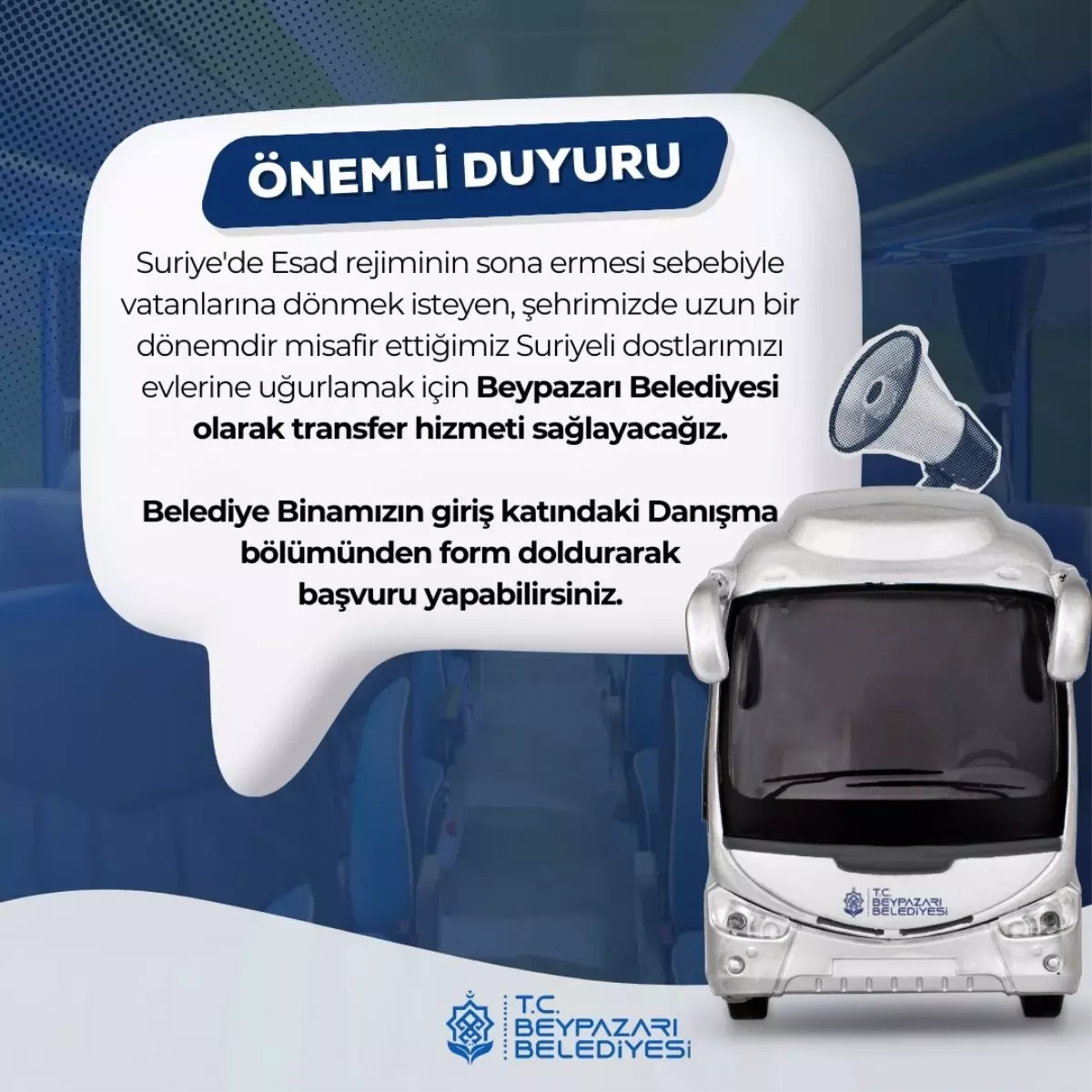 Beypazarı Belediyesi’nin sosyal medya hesabından yapılan açıklamada, “Suriye’de Esad rejiminin sona ermesi sebebiyle vatanlarına dönmek isteyen, şehrimizde uzun bir dönemdir misafir ettiğimiz Suriyeli dostlarımızı evlerine uğurlamak için Beypazarı Belediyesi olarak transfer hizmeti sağlayacağız. Belediye binamızın giriş katındaki danışma bölümünden form doldurarak başvuru yapabilirsiniz” denildi.