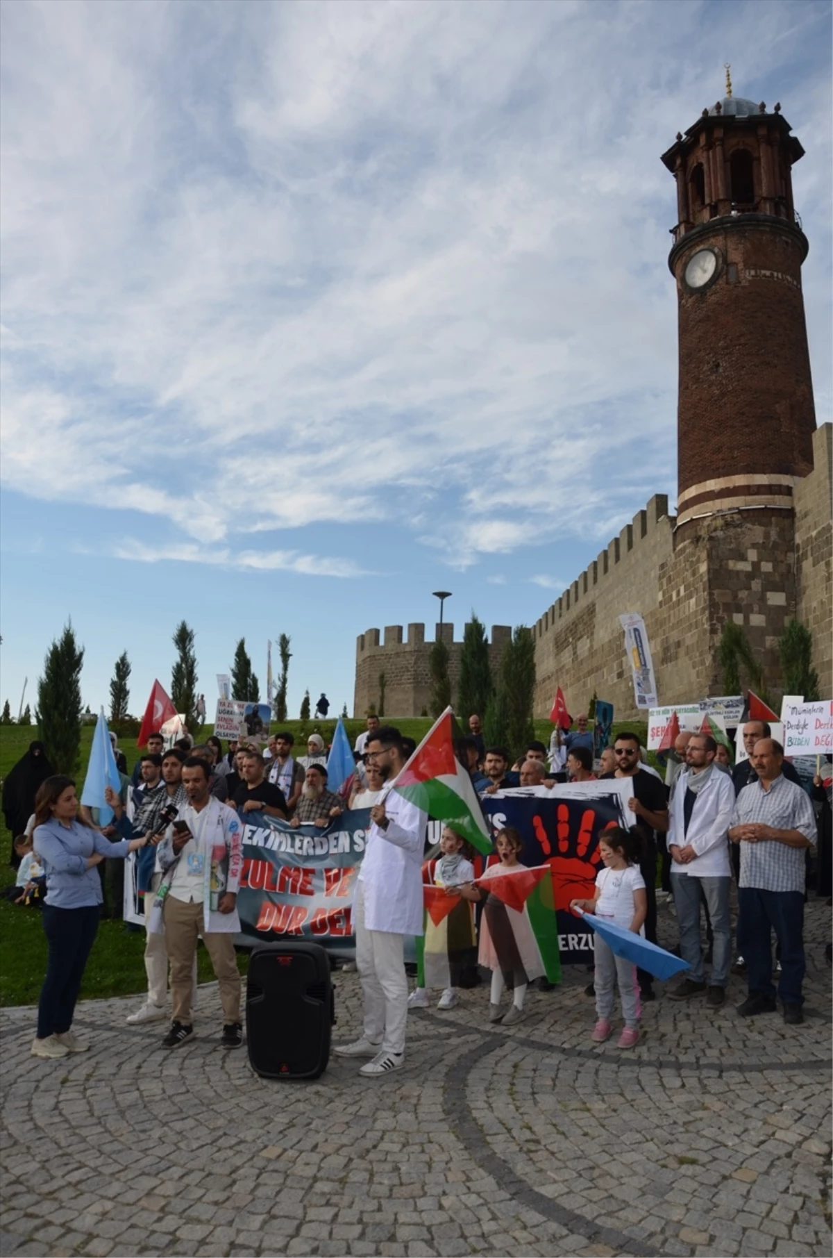 Kent merkezindeki Erzurum Kalesi önünde bir araya gelen doktorlar, tıp ve eczacılık fakültesi öğrencileri, sağlık çalışanları ile vatandaşlar, Türk, Filistin ve Doğu Türkistan bayrakları eşliğinde taşıdıkları döviz ve pankartlarla kale önündeki park ve etkinlik alanında yürüdü.